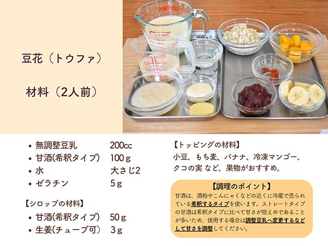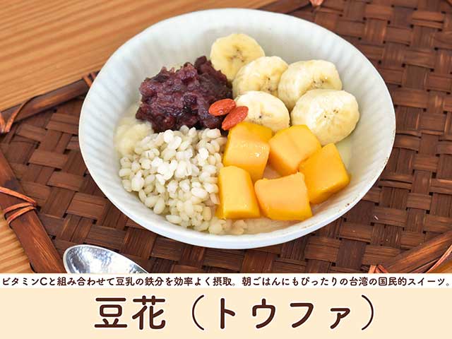 「豆乳は体内で合成できない必須アミノ酸をバランスよく含む良質なたんぱく質源です。代表成分の“大豆イソフラボン”は、女性ホルモン(エストロゲン)に似た働きをして、更年期症状の緩和や骨粗しょう症予防、肌のハリ改改善、シワやシミの抑制、乳がん・前立腺がんの予防など多くの効果が期待されます。さらに豆乳には、牛乳に少ない鉄分も含まれます。鉄分はコラーゲン生成を助け、肌のターンオーバーをサポートします。鉄分不足は血行不良などから乾燥・くすみ・たるみなどの原因となるため注意が必要です。今回のレシピのように、マンゴーやバナナなど、ビタミンCを含む果物と一緒に摂取することで鉄分の吸収率が高まります。キウイフルーツやいちごなどもビタミンCが豊富に含まれるので、トッピングにおススメです。」